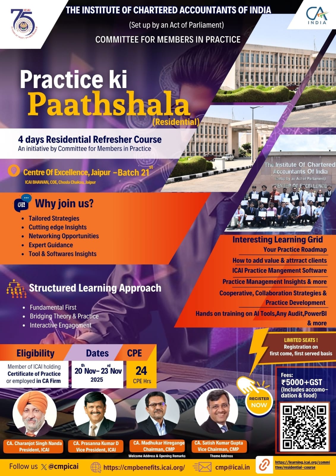 The 4 days Residential Refresher Course is being organised by the Committee for Members in Practice. The purpose is to impart key competencies vital for advancing participants’ professional practices and ensuring their continual alignment with the latest advancements in their respective fields of expertise. The course focuses on the gaining proficiency in utilizing advanced tools and technologies, gaining effective practice management, attaining personalised growth, discovering niche areas, gaining insights from experienced professionals and peers. It aims in technical expertise also fosters cross- culture appreciation and understanding of global requirements, thereby positioning them as leading professionals in the global arena.