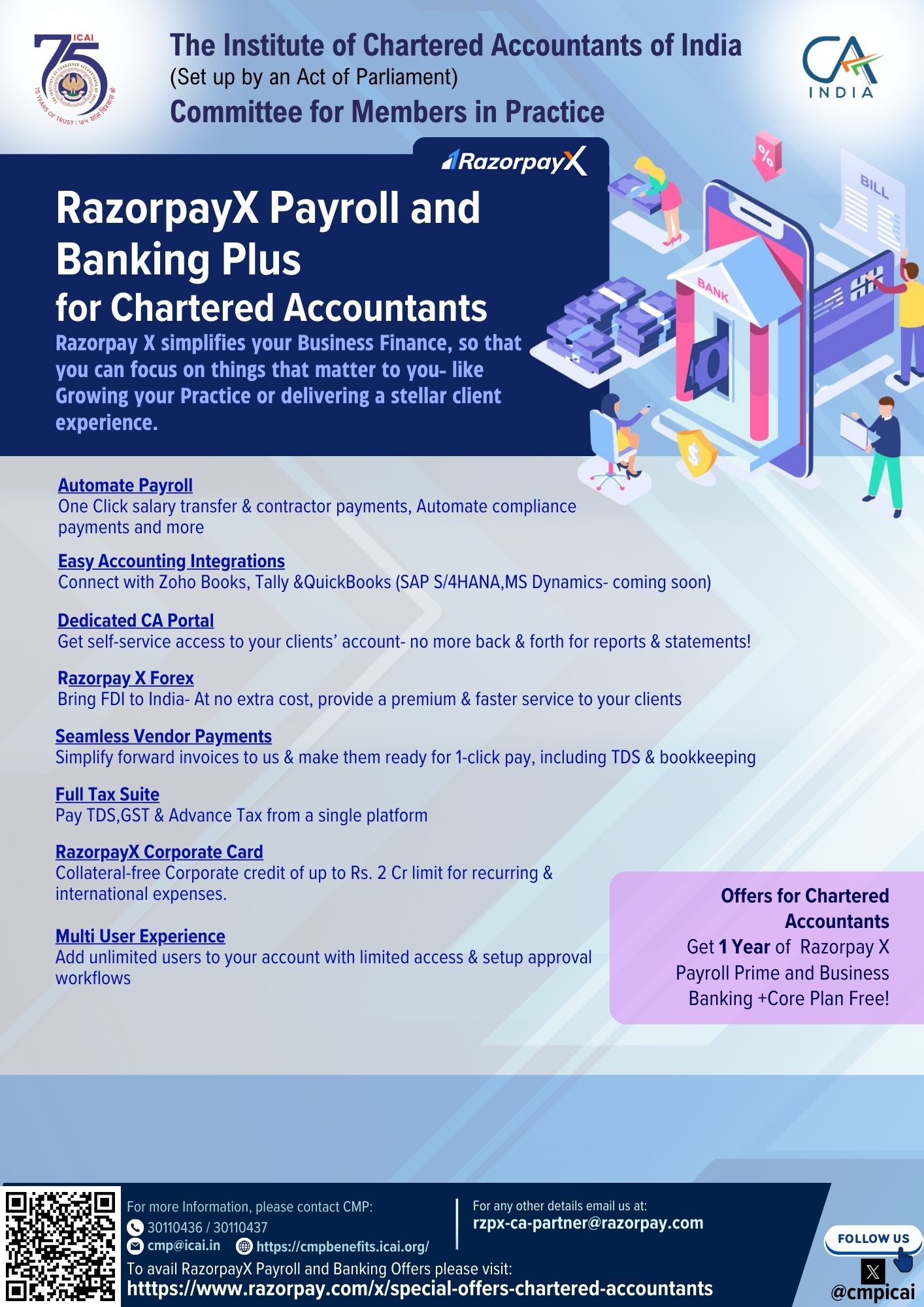 1. Members are requested to visit https://payroll.razorpay.com/special-offers-chartered-accountants and register using their ICAI Membership Number to avail free access for one year, with discounted services thereafter.
